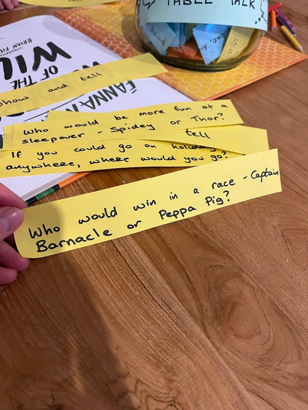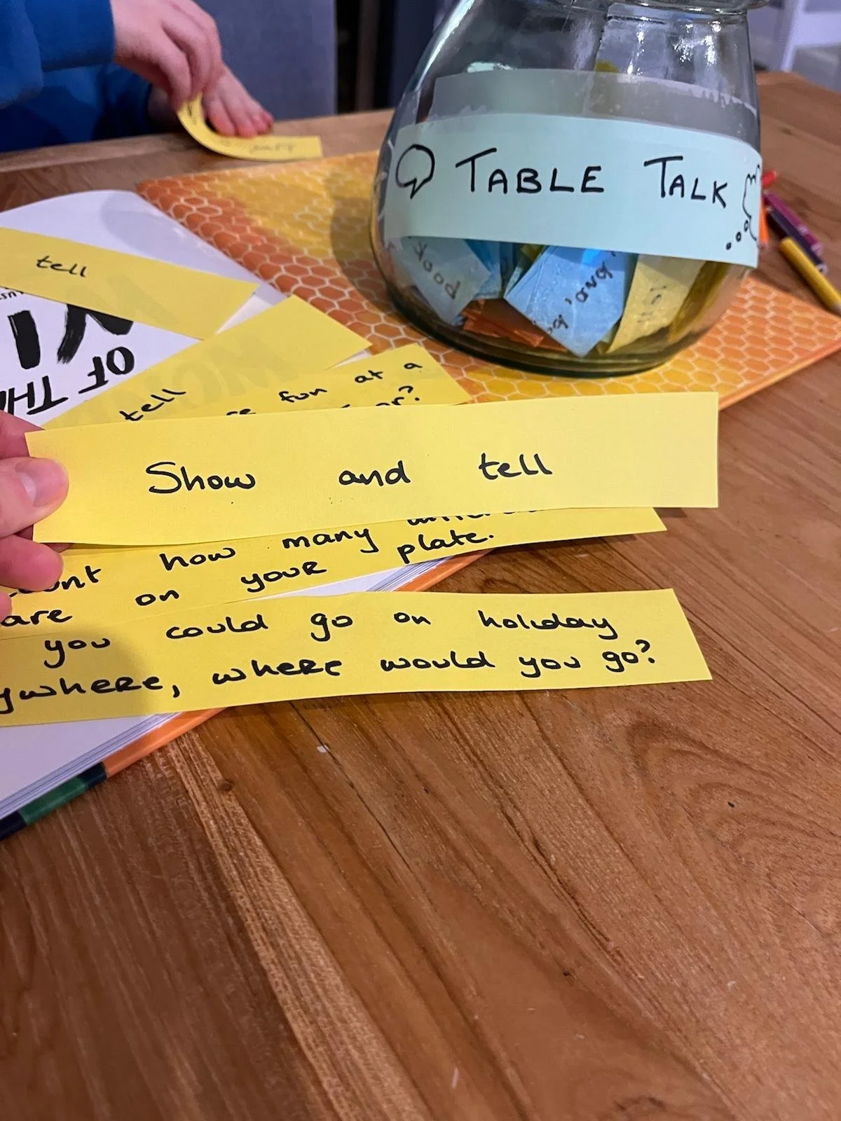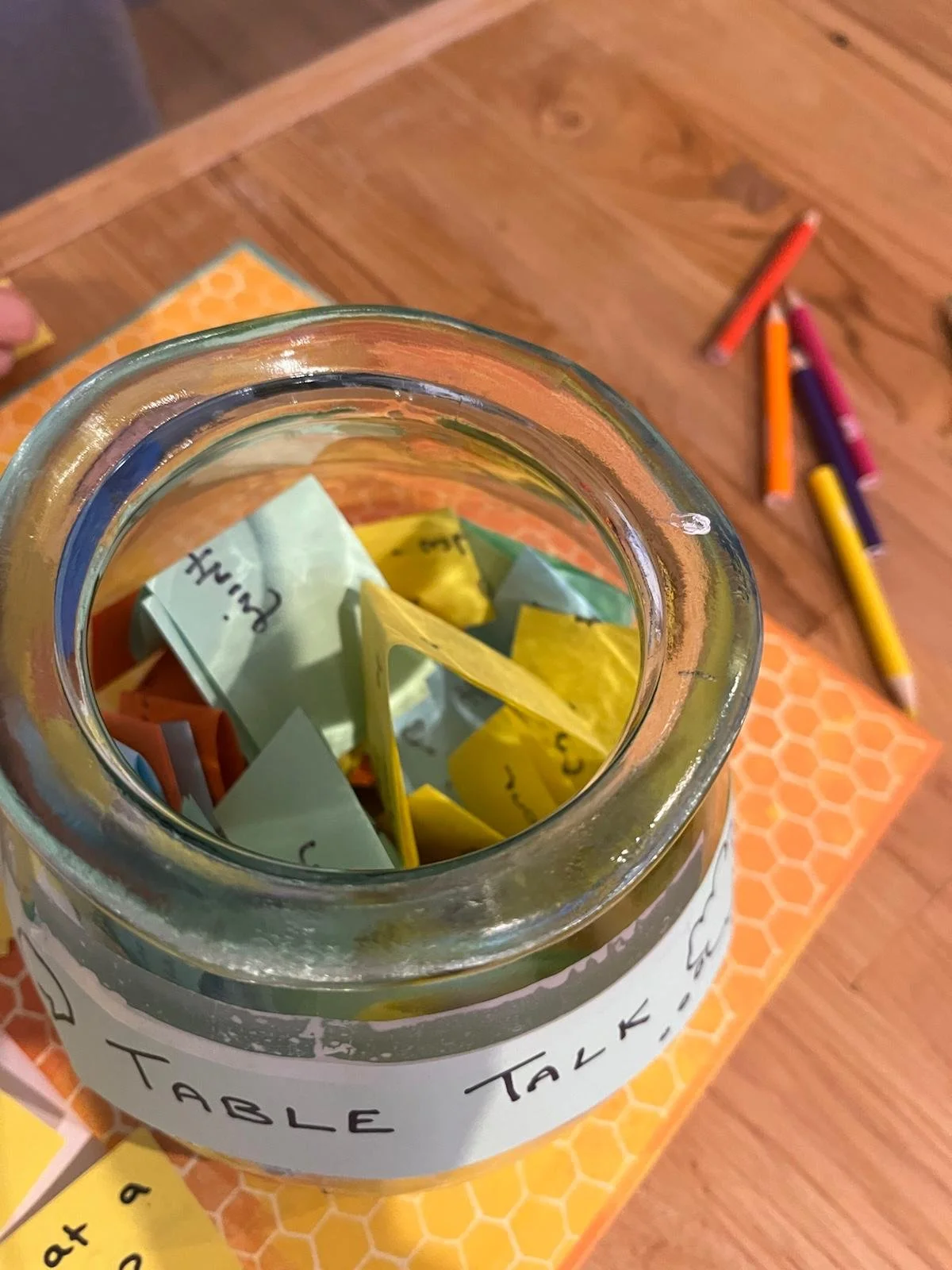 I put a large jar in the middle of the table filled with rolled-up pieces of colored paper. Each piece has a conversation prompt written on it.